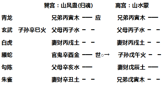 【原文】如酉月丙寅日占谒贵,得山风蛊卦变山水蒙。世临月建之官,定得面见;但被午火回头之克,须待子日冲去午火,方得拜谒。果见于丙子日。故曰∶“逢伤亦伤,却有待时之用。”