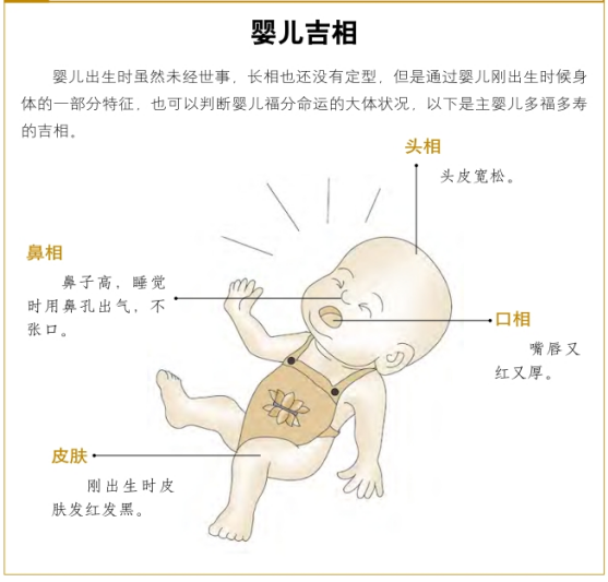 婴儿一出生,就能通过看相而知道他的命运。因此,给婴儿看相其实不是一件困难的事情。一般来说,刚出生的婴儿有着颜色发红发黑的皮肤,为大吉之相。而皮肤颜色发白的婴儿,则会在一个月之内死去。婴儿身体上有白磨(像浆糊一样黏糊糊的东西),是孕妇临盆前房事过多而导致婴儿受伤的缘故。这样的婴儿将来会患有疮病,也会常常为其他的疾病所缠身。